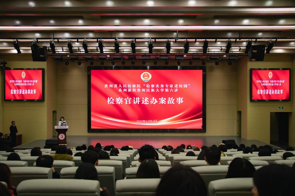 上午,“检察实务专家进校园——办案故事会”在贵州民族大学南校区图书馆一楼报告厅举行。贵州省人民检察院选派的五位资深检察官出席活动,他们聚焦刑事检察、公益诉讼、执行监督、检察侦查等多个实务领域,结合亲身承办的案件,分享了《三年“线”困终得解》《守护地心奇观:一场穿越溶洞的保卫战》《缺失的赔偿金:一份生效判决背后的执行困局》等生动案例。通过细致还原办案细节,他们深入诠释了宪法精神在司法实践中的具体贯彻,传递了一线司法工作者对法治的坚守与专业思考,并寄语青年学子积极投身法治建设。在场学生反响热烈,纷纷表示这些充满温度与思辨的办案故事,使宪法与法治从“书本上的概念”真正转化为“可感知的实践”。