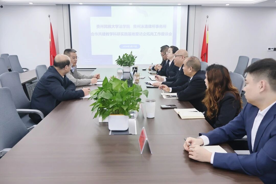 2026年3月11日上午,贵州民族大学法学院与贵州泳清律师事务所合作共建教学科研实践基地暨访企拓岗工作座谈会,在贵州泳清律师事务所举行。贵州民族大学法学院党委书记柏云兴、杨震老师一行,与贵州泳清律师事务所党支部书记张仁刚、副书记张开琴、律所副主任李和江、肖丽蓉及律师代表江永林、吴富环等,围绕校所合作规划、内容落地、责任义务等议题展开研讨,达成了重要共识,为校所协同发展、共育法治人才奠定坚实基础。