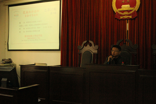 2016年12月15日下午1点,法学院主办的花溪法治论坛第23期开讲。法学院邀请花溪区人民检察院公诉科杭进科长在法学院模拟法庭作主题为“检察实务与检察工作技巧”的讲座。法学院党委书记盘淼教授、傅智文博士出席讲座,我院部分教师、研究生、本科生参与了此次讲座。讲座由党委书记盘淼教授主持。